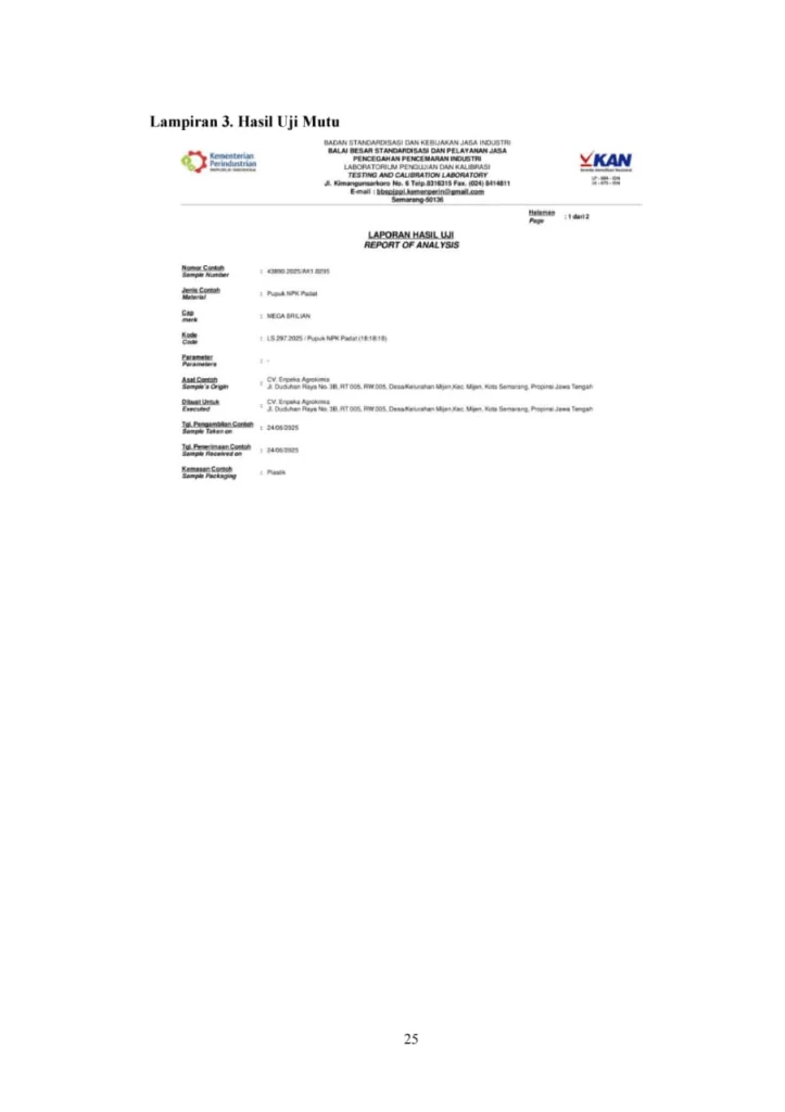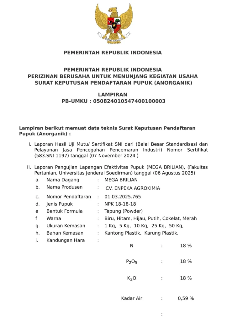 Mega Brilian adalah premium fertilizer atau pupuk kualitas tinggi buatan lokal. Diproduksi oleh CV Enpeka Agrokimia didistribusikan secara resmi oleh distributor tunggal PT Bandung Eco Sinergi Teknologi.